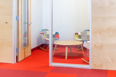 Another favorite local fabricator, Superfab collaborated with us to build an eye-catching pixelated backdrop for another conference room, also using CNC routed plywood panels. Plywood was also used as display plaques and in a custom Kerf wall, both proudly showcasing the various brands from NetRush's client list. However, our favorite element in the space is the custom hammock enclosures made out of laser cut steel and rope.