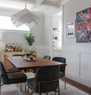 Our clients moved to Portland with an incredible art collection but had trouble envisioning how their pieces would fit in their traditional new home. Wise Design was brought on to furnish their living, dining, office and den. Our task was to look for not only the ideal placement for each art piece but also to design a comfortable home for our clients, their friends and their elderly dog, a very cherished member of the family. Using the two of the spectacular pieces by HERAKUT as the basis of our palette, a new deep green sofa from Perch Furniture rests in the center of the living room, allowing our clients to gaze at the fire, TV or outside. The back deck is fully furnished for impromptu parties and FLOR tiles allow for easy circulation from the front door to the back so their sweet doggo can walk without slipping. Layers of warmth with woods and more gentle greens are found throughout the space with the dining room chairs and table and mod desk in the office. Cozy lounge chairs including a spectacular oversized one in the den provide plenty of options for cuddling up with their pooch.